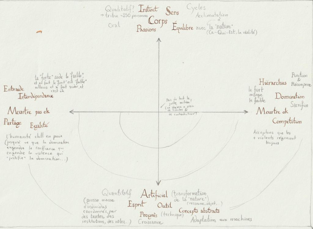 Le demi-cercle le plus extérieur : j’hésitais à le qualifier de « révolutionnaire », mais le fascisme en fait partie, et c’est une idéologie explicitement régressive (« Nous sommes les barbares qui rajeuniront le monde. »). C’est donc le cercle des idéologies trop-loin-vers-telle-valeur-pour-rester-à-l’intérieur-de-la-tièdasse-bourgeoisie, ou bien de ses esclaves uberisés. Et non, je n’utiliserai pas le terme « extrême », car la bourgeoisie est elle tout aussi extrême dans son maintien d’un statu-quo écocidaire, et parfois ce qui s’en éloigne radicalement a énormément de sens (comme parfois ça empire la situation j’avoue, l’avenir, toujours un pari).
